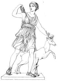 Artemis | Jungfräuliche Göttin der Jagd und des Mondes (zusammen mit Selene) Tochter des Zeus und der Leto Zwillingsschwester des Apollon Keinem Manne untertan, sondern frei und kinderlos Himmelskörper: Mond | Pfeil und silberner Bogen Köcher Wermutkraut Hirschkuh Mondsichel | ![]() |