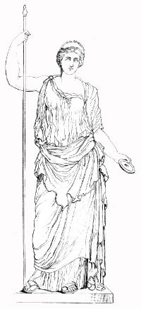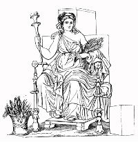 Hera | Göttin der Ehe, des Herdes, der Familie Helferin in den Nöten der Entbindung Eifersüchtige Gattin und Schwester des Zeus Mutter von Ares, Hephaistos, Hebe und Eileithyia | Pfau Kuckuck königliche Kopfbinde Granatapfel Getreide | ![]() |