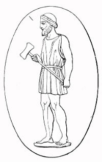 Hephaistos | Gott der Vulkane, des Feuers, der Schmiedekunst und der Architektur (baute den Göttern ihre Paläste und gab den Menschen die Hausbaukunst) Schmiedete mit den Zyklopen für Zeus die Donnerkeile Sohn von Zeus und Hera Von Zeus vom Olymp geschleudert und seitdem lahm Verheiratet mit Aphrodite, die ihn mit Ares betrog | Schmiedehammer bzw. -zange Beil Pilos (Handwerkerkappe) | ![]() |